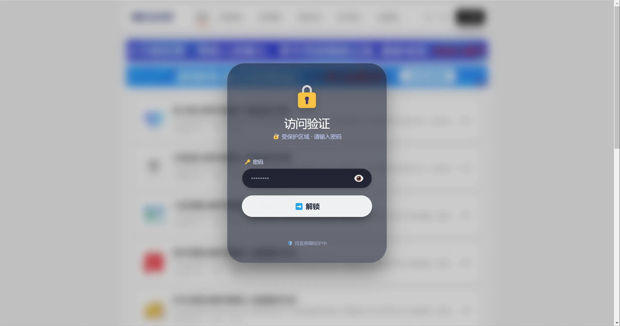 锁定状态:访客看到的是模糊不清的页面背景,中央悬浮一个毛玻璃卡片,提示输入密码。鼠标无法点击背景中的任何链接或按钮。
